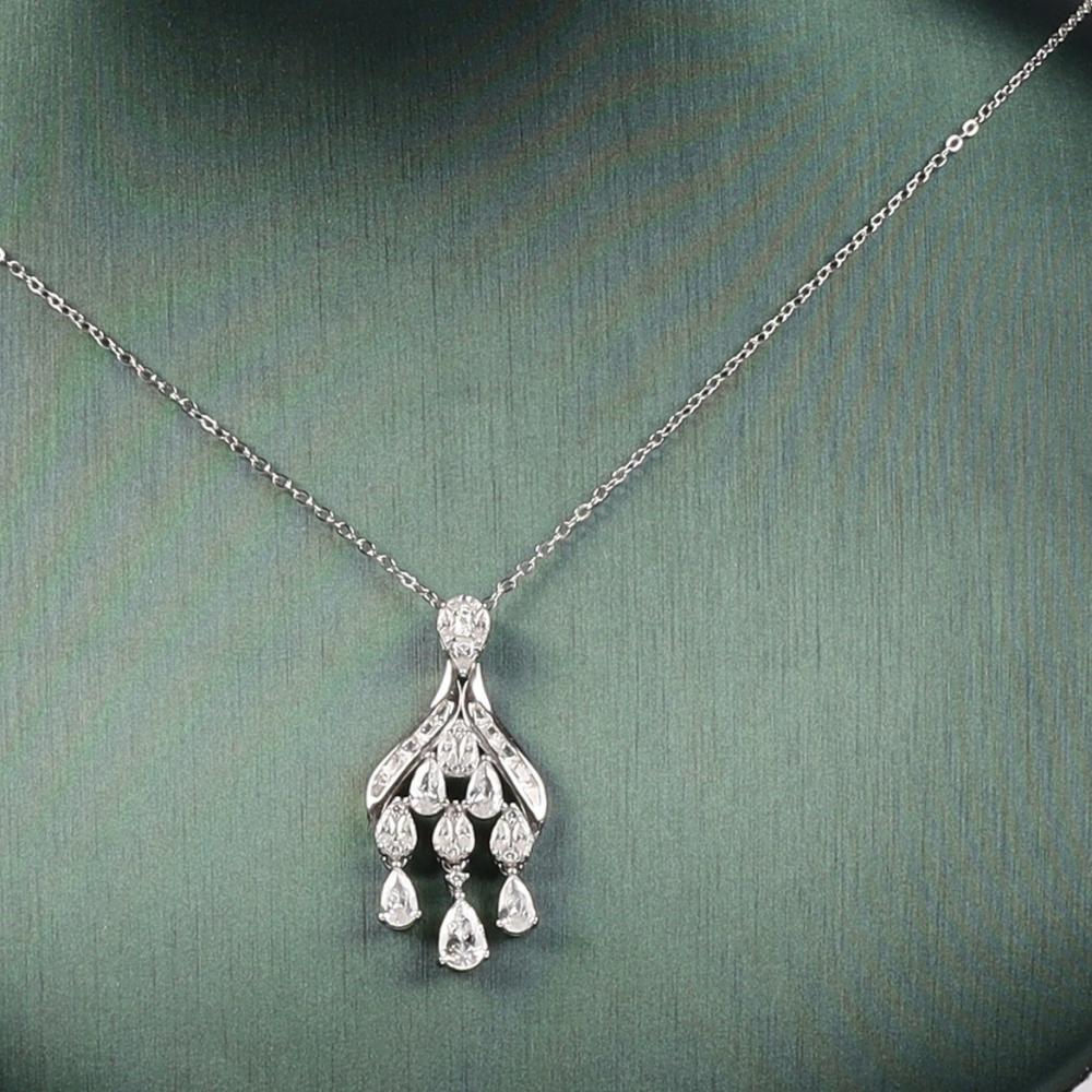 هذا الطقم الفاخر من فضة 925 يتميّز بتصميم متدلٍ يشبه قطرات الماء المتلألئة التي تنساب بلطف على البشرة.