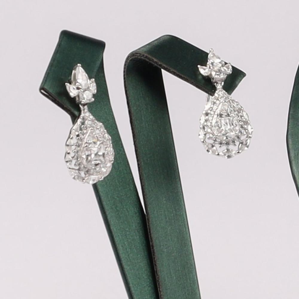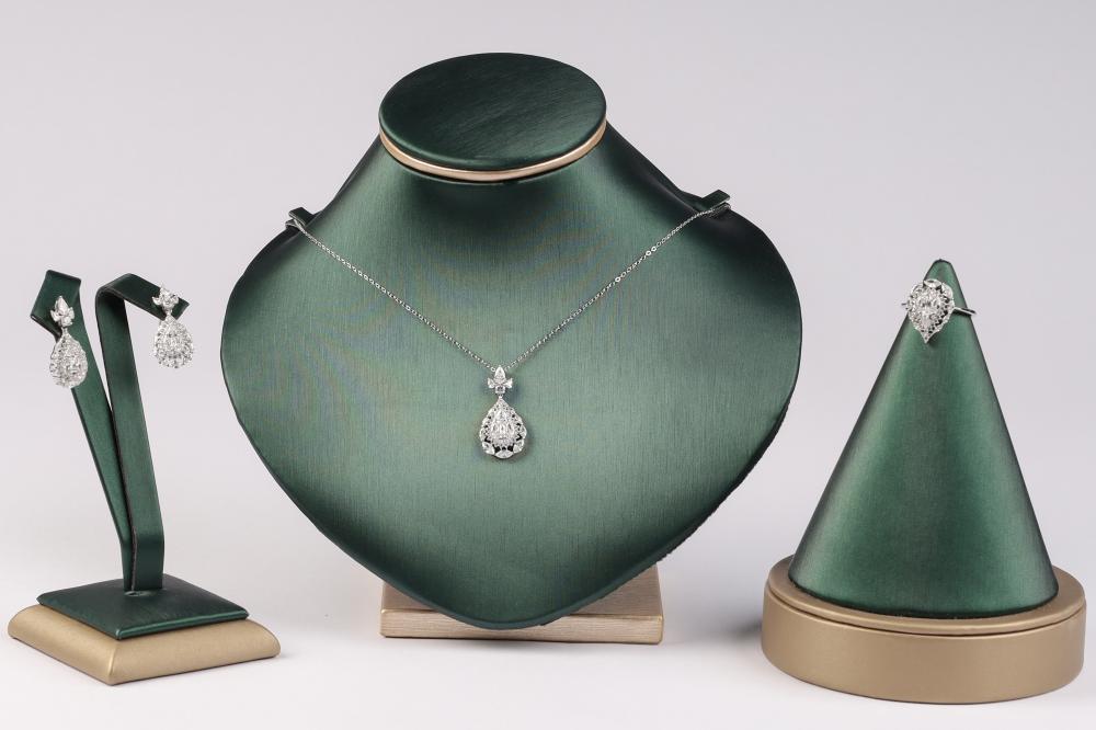 طقم مصاغ من فضة 925 اللامعة، بتصميم انسيابي يجمع بين النعومة والبذخ. شكل القطرة المقلوبة يرمز للنقاء، ويحيط بها هالة متألقة من الزركون عالي الجودة، ما يمنح الطقم لمسة فاخرة تُخطف الأنظار.